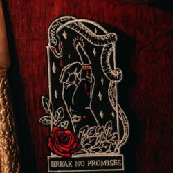 2.5"Wx4"H coffin-shaped embroidered patch featuring an iron-on backing. Patch reads "break no promises." We recommend that you apply a few stitches so the corners do not lift.