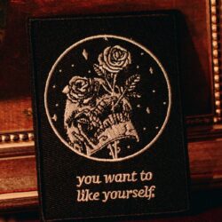 2.75"Wx3.75"H rectangular embroidered patch featuring an iron-on backing. Patch reads "you want to like yourself" and features a skull and roses. We recommend that you apply a few stitches so the corners do not lift.