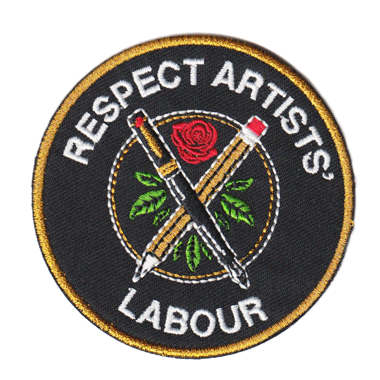 3"x3" embroidered patch featuring metallic gold thread, an iron-on backing, and reads "respect artists' labour." We recommend that you apply a few stitches so the corners do not lift.