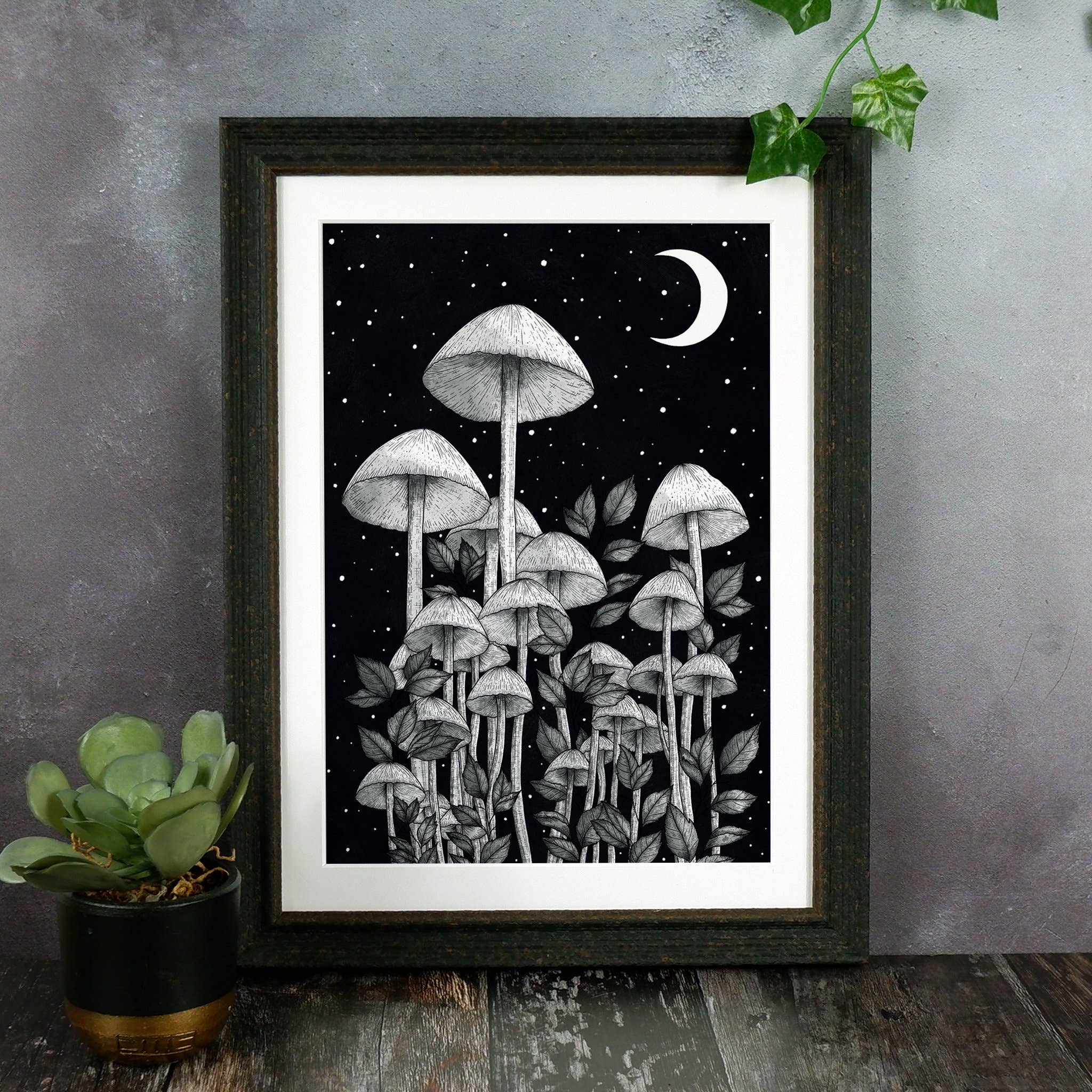 A beautiful and enchanting digital art print of a magical mushroom forest in the moonlight, printed in black and white.